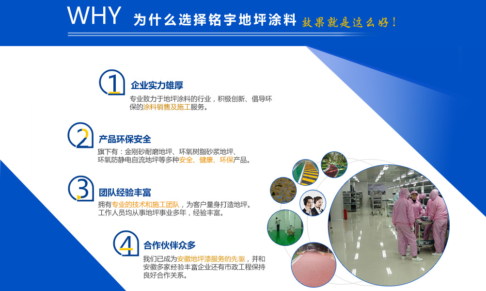 安徽銘宇建材科技有限公司是一家致力于地坪涂料的行業,旗下有金剛砂耐磨地坪,環氧樹脂砂漿地坪,環氧防靜電自流地坪,停車場防滑地坪,混凝土密封固化劑和丙烯酸球場,無震動止滑車道、塑膠跑道、工廠地板漆等工程施工服務?! {借本身的技術能力和研發條件,加上多年對環氧地坪和耐磨硬化地坪等各類工業地坪的涂裝、施工的實踐經驗、技術己處于國內專業水平,經檢測機構檢驗符合相應的技術標準。同時安徽銘宇建材科技有限公司還組建了經驗豐富的工程技術隊伍以及工程施工隊伍、簡歷了完善的售后施工服務體系,滿足用戶的需要。 安徽銘宇建材科技有限公司是一家積極創新、倡導環保的涂料銷售及施工服務的廠家,安徽銘宇建材科技有限...